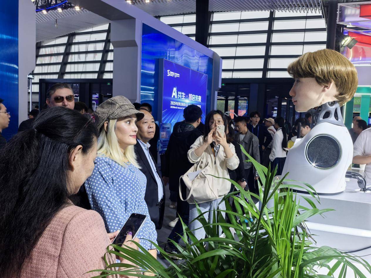 观众与松延动力仿生机器人互动,这款自主研发的仿生机器人可实时识别并模仿互动对象的各种面部表情。中国经济网记者郭文培/摄