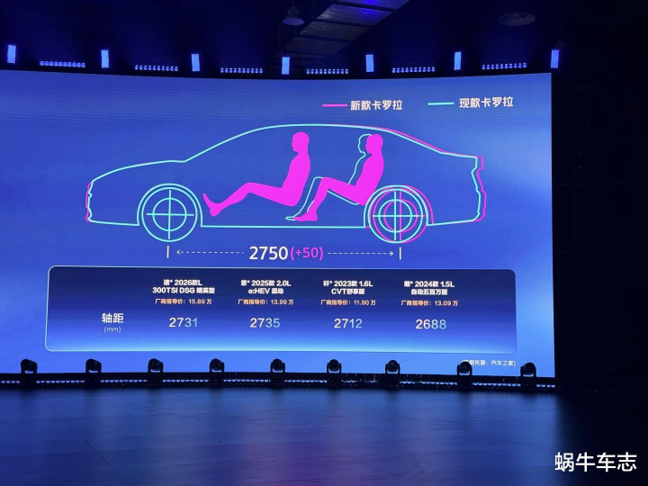 其次是轴距加长了50mm,2750mm的轴距与亚洲狮一致了。作为参考,刚完成换代的朗逸Pro轴距也才2688mm,更注重空间的速腾是2731mm,而轩逸是2712mm,所以对比之下就能很直观的发现,新款卡罗拉的后排空间会更有优势。此外,官方表示,新车的后备箱容积达到470L。