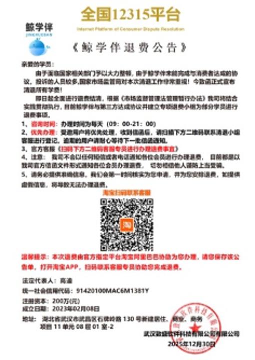 十甫寸收到的《鲸学伴退费公告》。