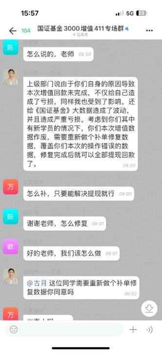 多名骗局受害人告知记者,这类“退费”陷阱在他们入局后,会演变为以“投资”形式退费,即引导受害人“购买理财产品返利”或“充值退费”。以十甫寸为例,所谓的“规划师”表示由“国新国证基金管理有限公司”接手学员退费事宜,要求通过购买该公司基金进行升值提现的形式退掉学费。一开始,她为“规划师”提供的手机号充值了100元,很快微信就收到了120元,然后她就被拉入了一个6人小群,群内除了她和“规划师”之外,还有另外3名“学员”及一位自称来自“国家金融监督管理总局”的工作人员。