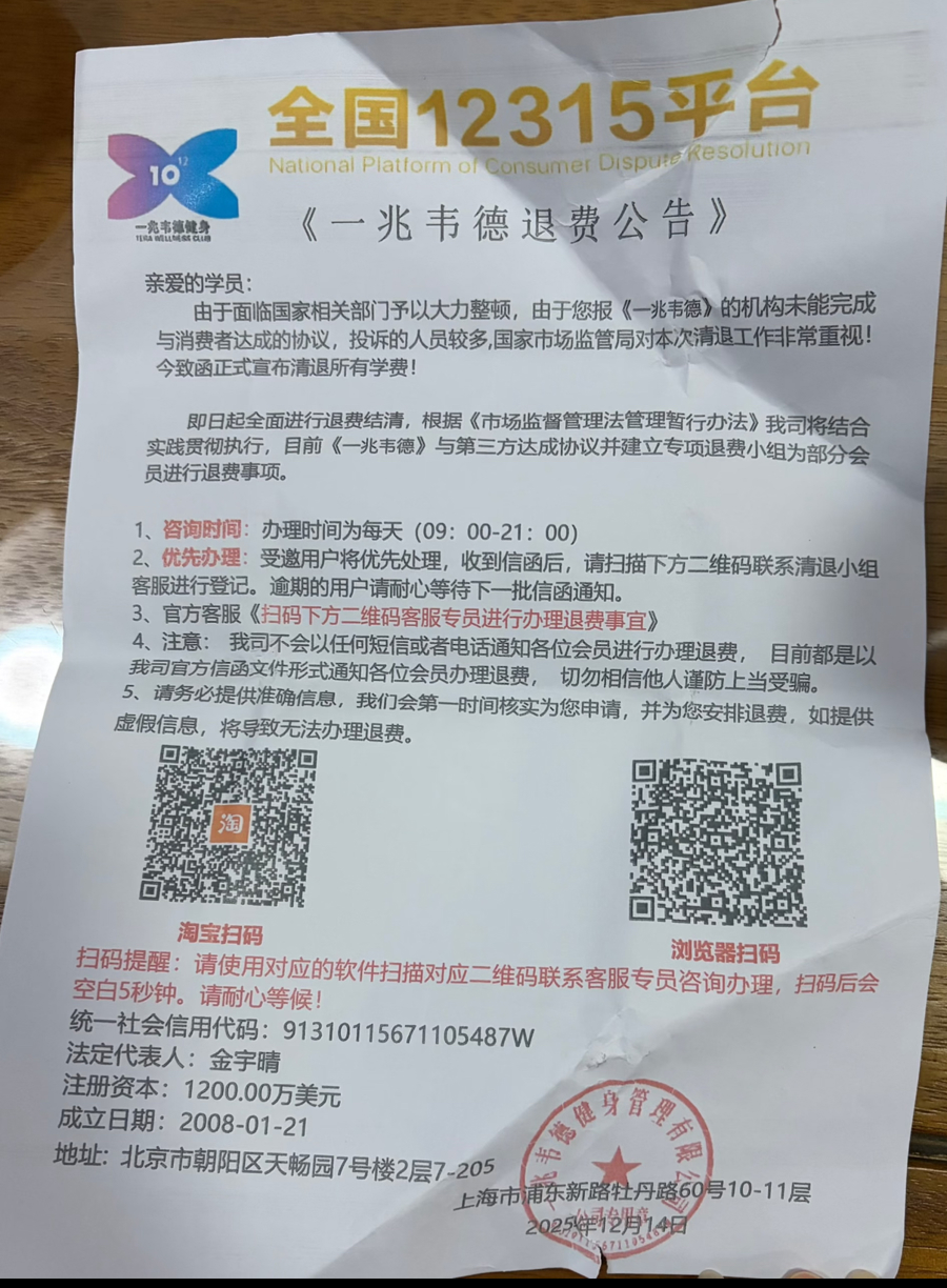 他和帖主在近期都因为收到一则“退费公告”陷入了骗局,记者走访后发现,近期各省市均有此类骗局发生。内容因地而异,如上海多名市民就收到以“一兆韦德”名义发出的退费公告,有市民甚至因这类骗局损失40余万元。