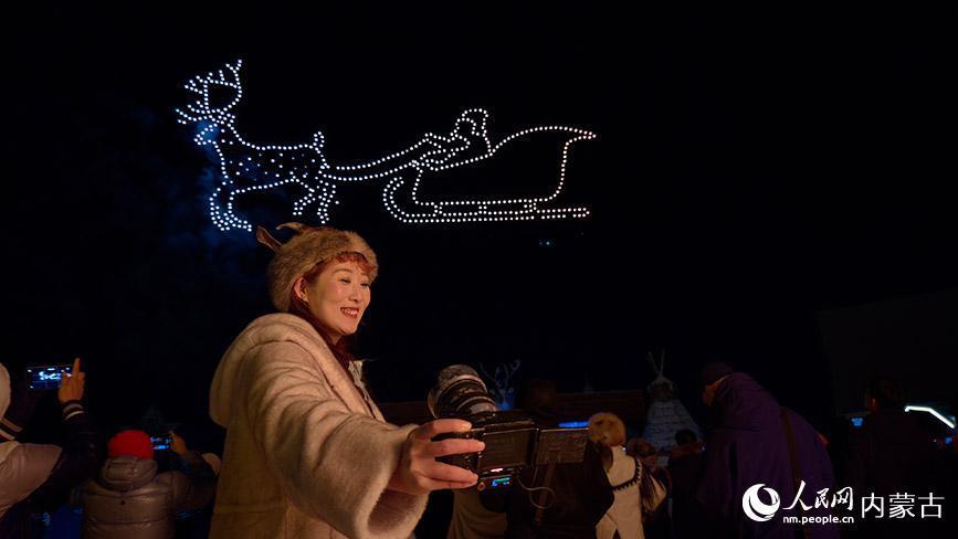 11月6日,呼伦贝尔市根河市的敖鲁古雅广场,游客在无人机表演现场拍照留念。人民网记者 张力洋摄