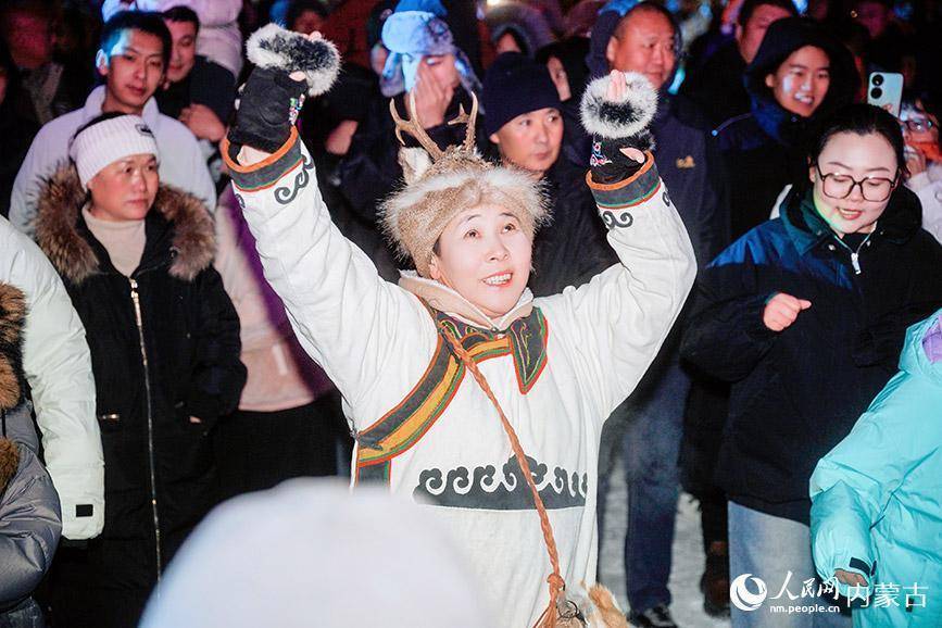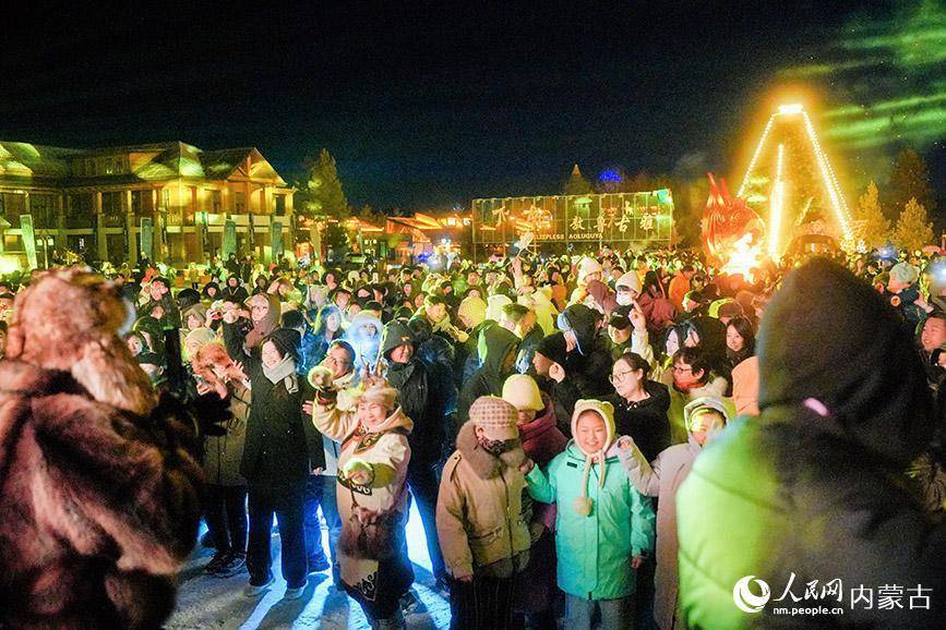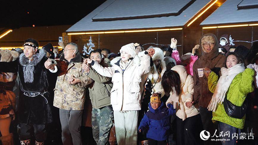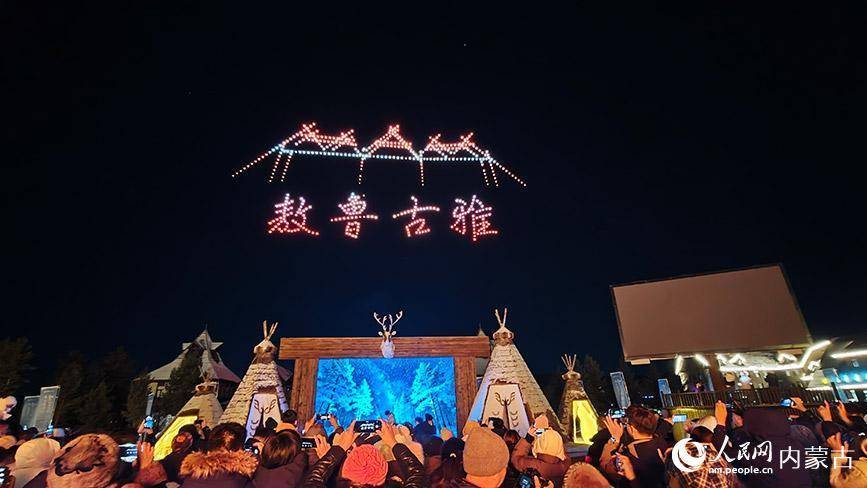 启动前夕,夜幕下的敖鲁古雅广场,一场浪漫的篝火晚会点燃了夜空。游客们穿过撮罗子,将桦树皮投入篝火,象征着冰雪与热情的“约定”就此缔结。随后,数百架无人机编队升空,精准组成“中国冷极 驯鹿之乡”“歌游内蒙古 欢乐冰雪季”等巨幅动态图案,光影交织,场面蔚为壮观。璀璨烟花绽放的瞬间,“天南海北一家人——友好文化馆志愿者歌友会呼伦贝尔行”登场,载歌载舞、暖意融融。