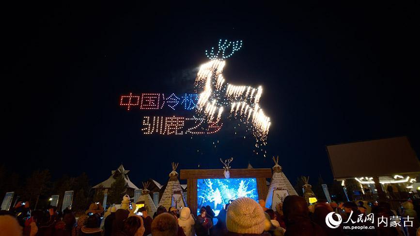 11月6日,呼伦贝尔市根河市的敖鲁古雅广场,数百架无人机编队升空,精准组成“中国冷极 驯鹿之乡”巨幅动态图案。人民网记者 富丽娟摄