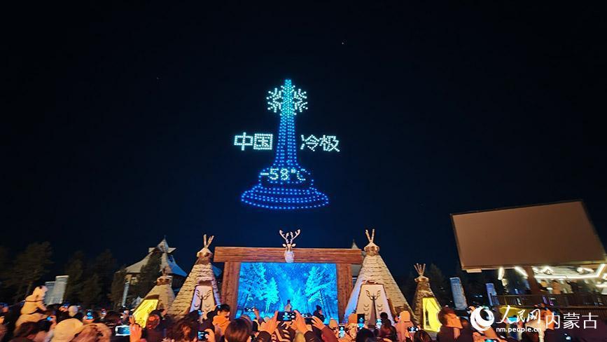 11月6日,呼伦贝尔市根河市的敖鲁古雅广场,数百架无人机编队升空,精准组成“中国冷极 ”巨幅动态图案。人民网记者 张力洋摄